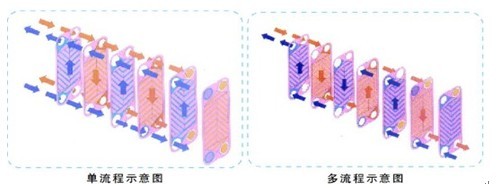 板式換熱器是由高效傳熱板片、密封膠墊、加緊螺栓及框架等主要部件組成。板片四個(gè)角開(kāi)有角孔,鑲貼有密封膠墊的板片安裝在固定加緊板和活動(dòng)加緊板之間的框架上,用加緊螺栓加緊,密封膠墊按人為設(shè)計(jì)的流程形式將各傳熱板片密封聯(lián)接,形成迷宮式的介質(zhì)流道,兩種換熱介質(zhì)在相鄰的流道內(nèi)互相逆流,形成充分的熱交換。傳熱板片用優(yōu)質(zhì)耐腐蝕金屬薄板壓制而成,波紋為人字型,相鄰板片具有反方向的人字型溝槽,溝槽的交叉點(diǎn)相互支撐形成接觸點(diǎn),介質(zhì)流動(dòng)時(shí)形成湍流狀態(tài),獲得很高的傳熱效率。