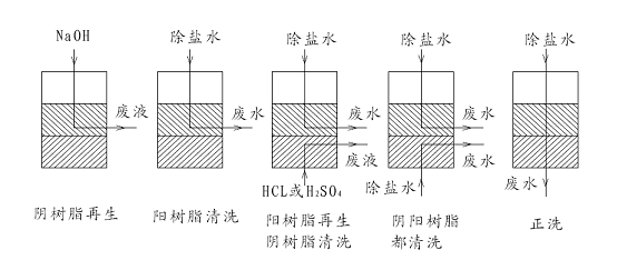 不被水沖出為最佳控制流速,以陰陽樹脂分層界限分明為反洗終點。反洗結束時應緩慢關閉反洗閥,使